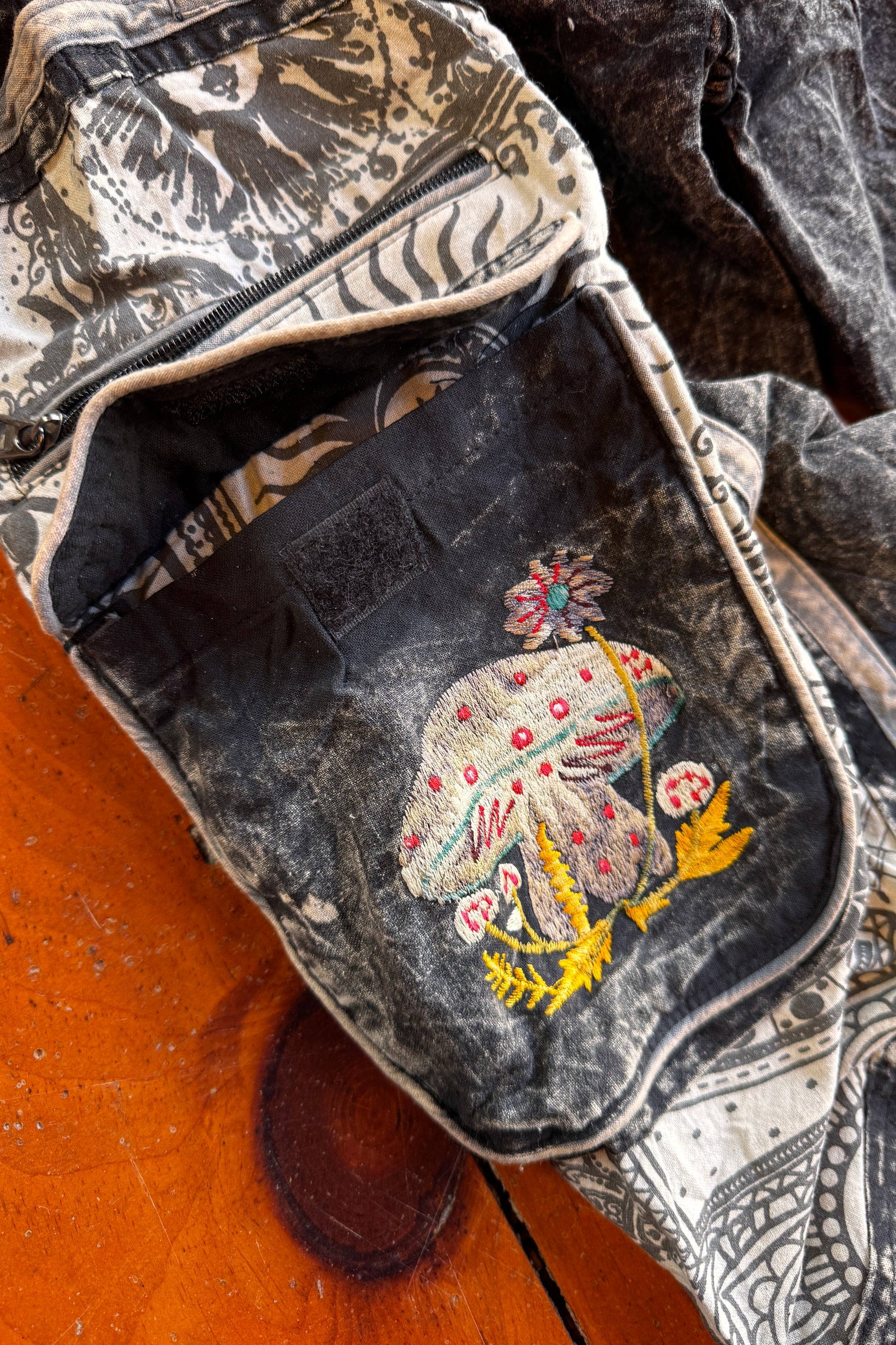 Mystical meets functional in these black and teal joggers featuring celestial and nature inspired details. A circular sun and moon print patch adorns the side, while hand stitched mushrooms with blooming flowers underneath add artisan charm.