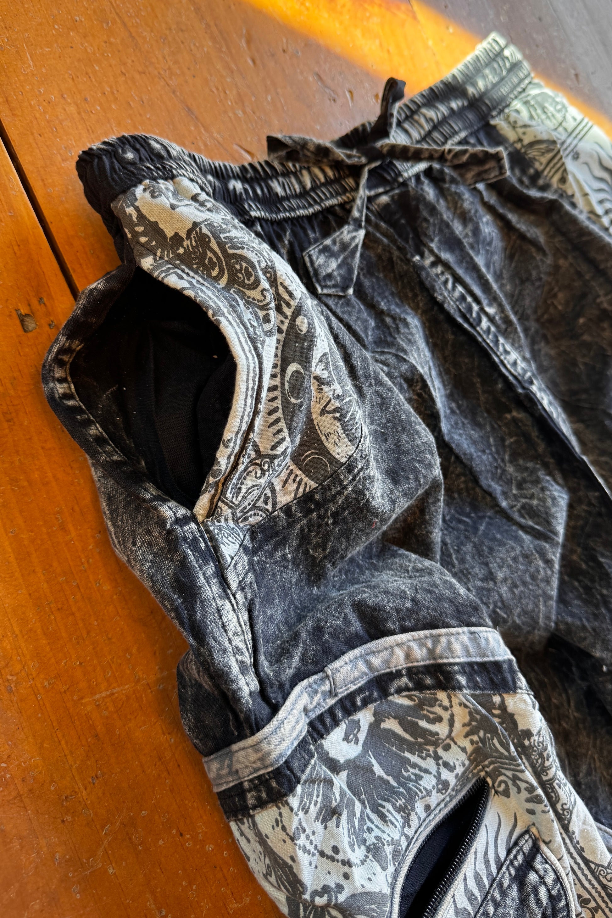 Designed for comfort and utility, these joggers feature cargo pockets with hidden zipper pockets underneath for secure storage, plus slit pockets for easy access. Available in sizes S, M, L, and XL. These run pretty true to size, with length increasing proportionally with each size up.