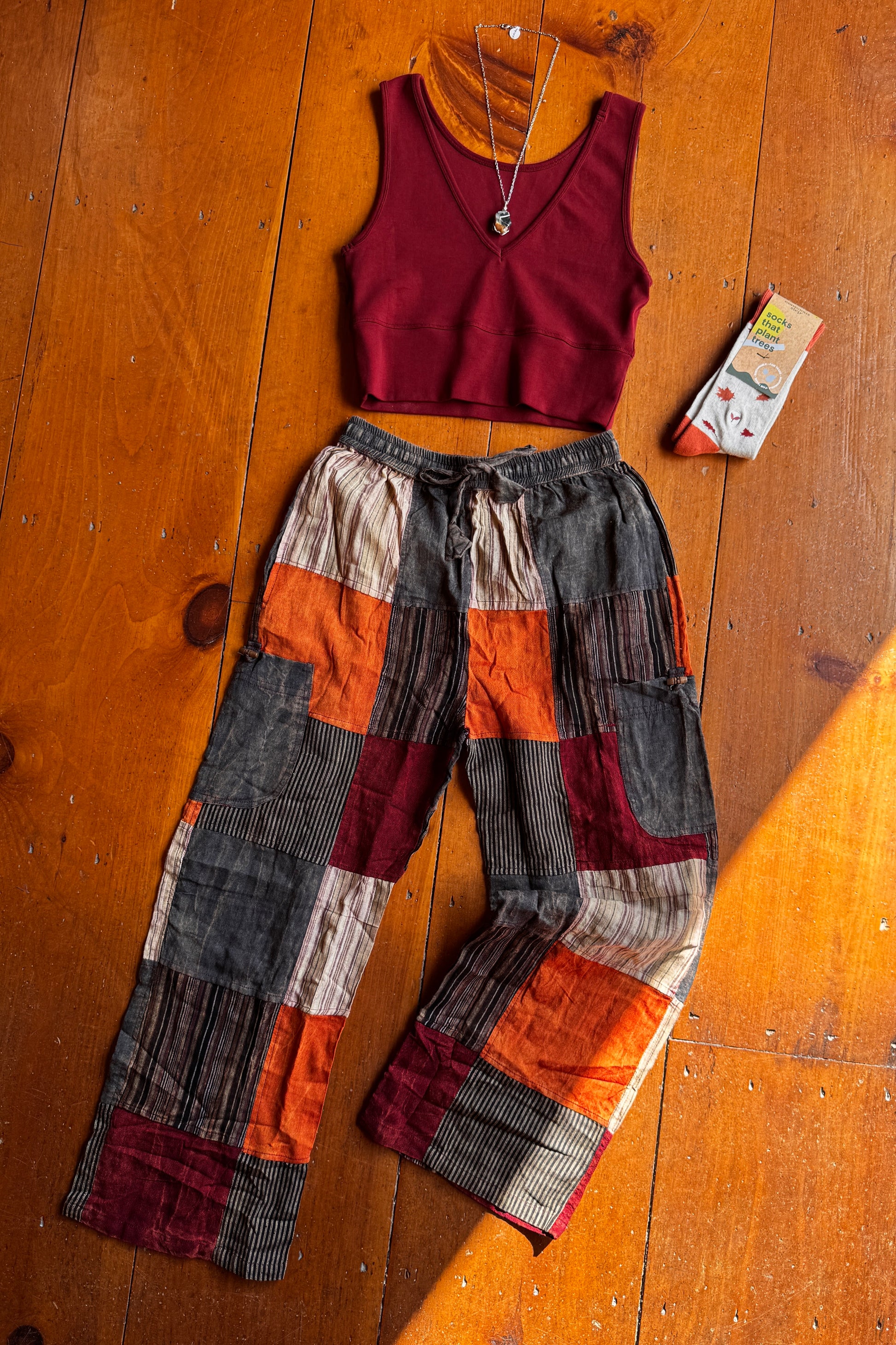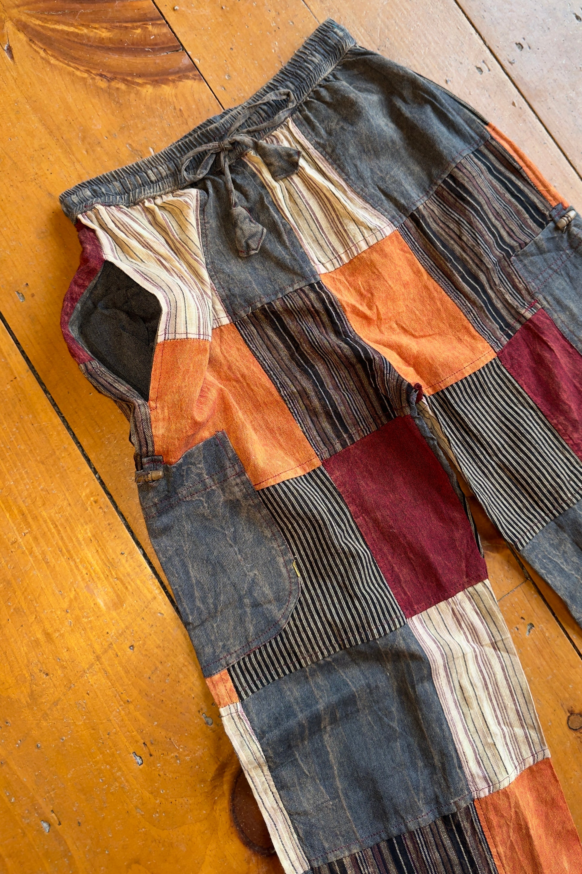 The Grand Canyon Multi-Color Patchwork Pant brings bold, earthy tones and creative design together in one statement piece. Featuring a vibrant mix of orange patches, burgundy accents, and vertical striped details, these pants capture the spirit of desert landscapes and free-spirited style.