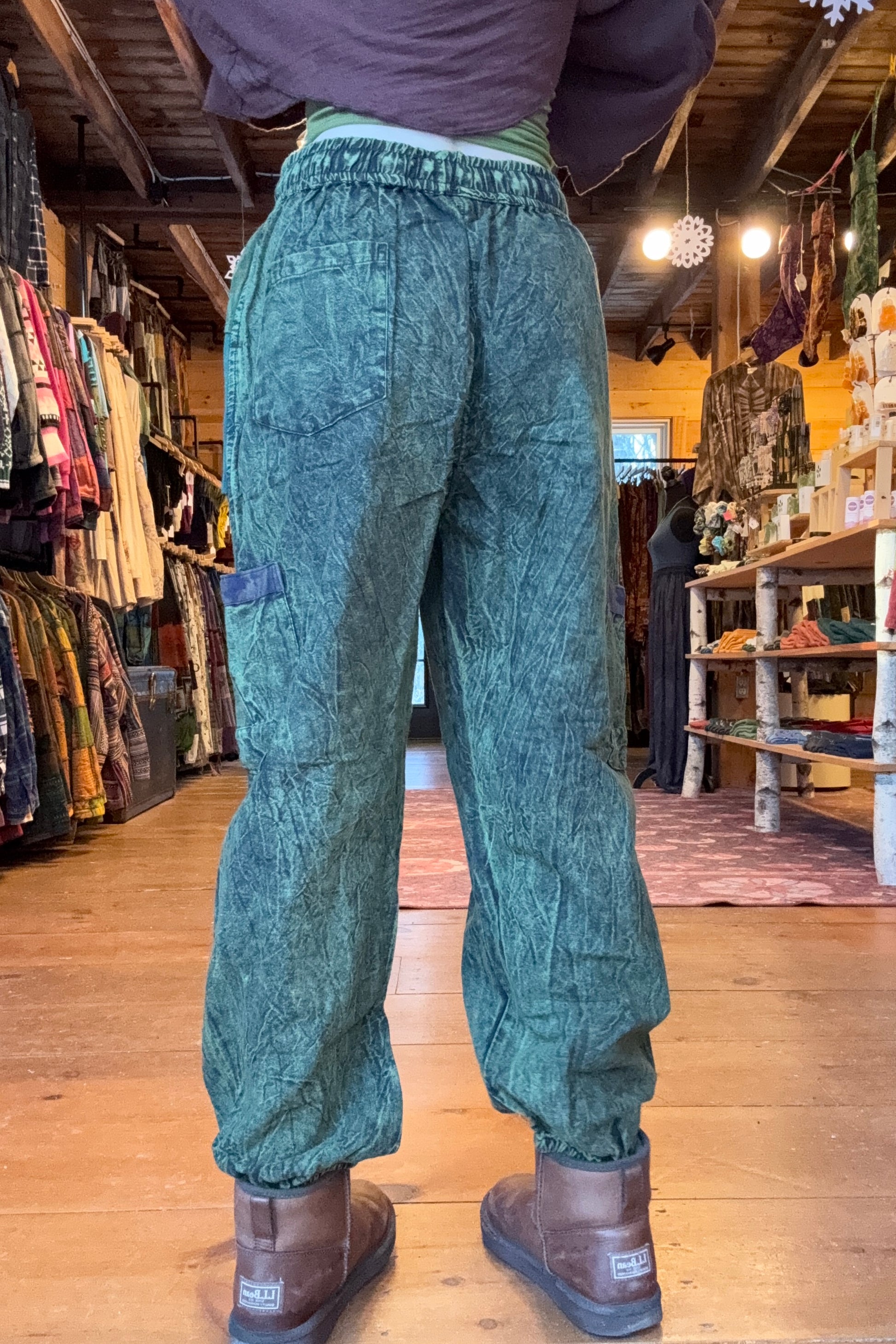 Earthy sage green meets a vibrant mix of pine green, navy blue, purple, and washed out red in these handcrafted patchwork cargo joggers. Each pair features unique color-blocked patches throughout, creating a one-of-a-kind look that celebrates upcycled materials and artisan craftsmanship.