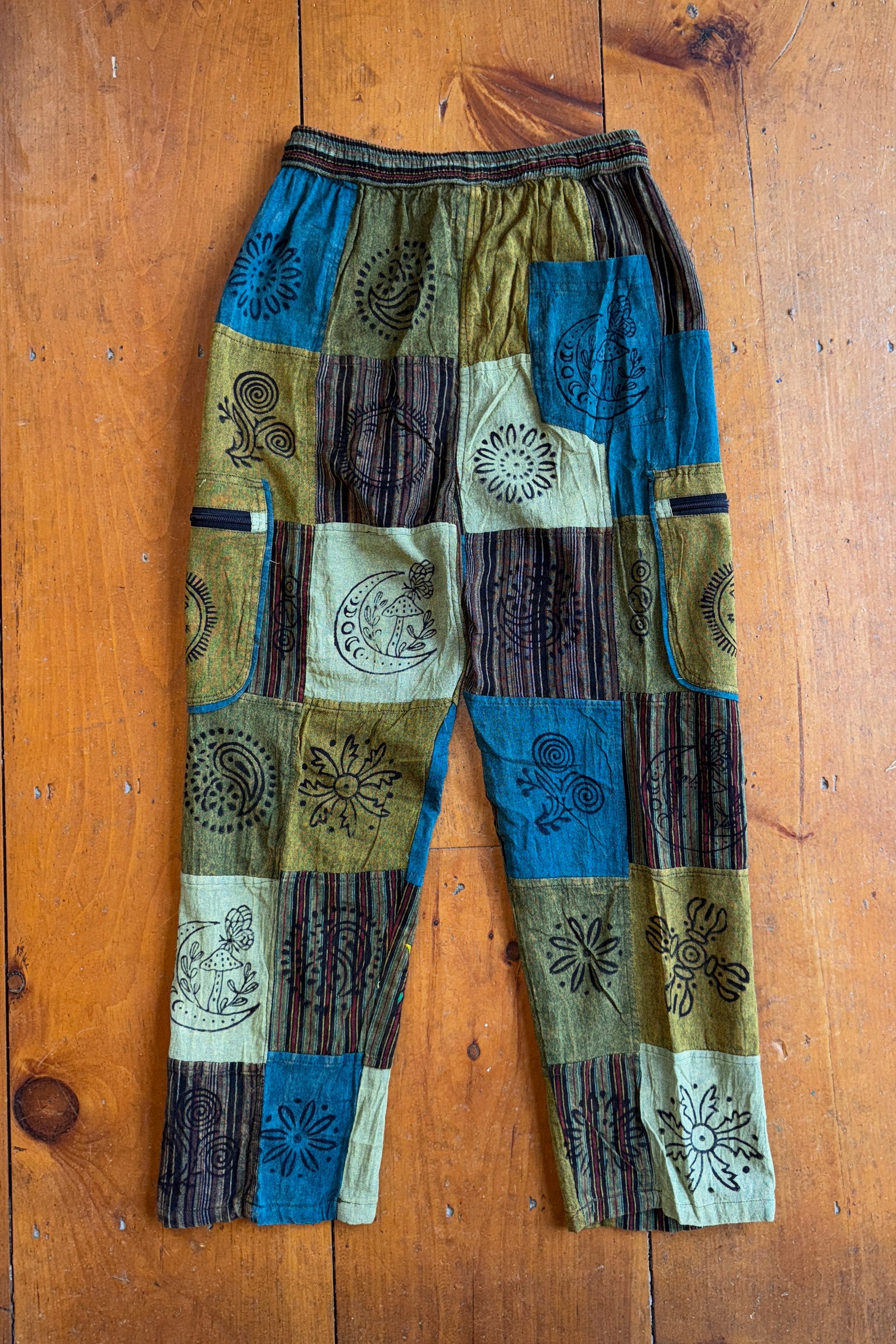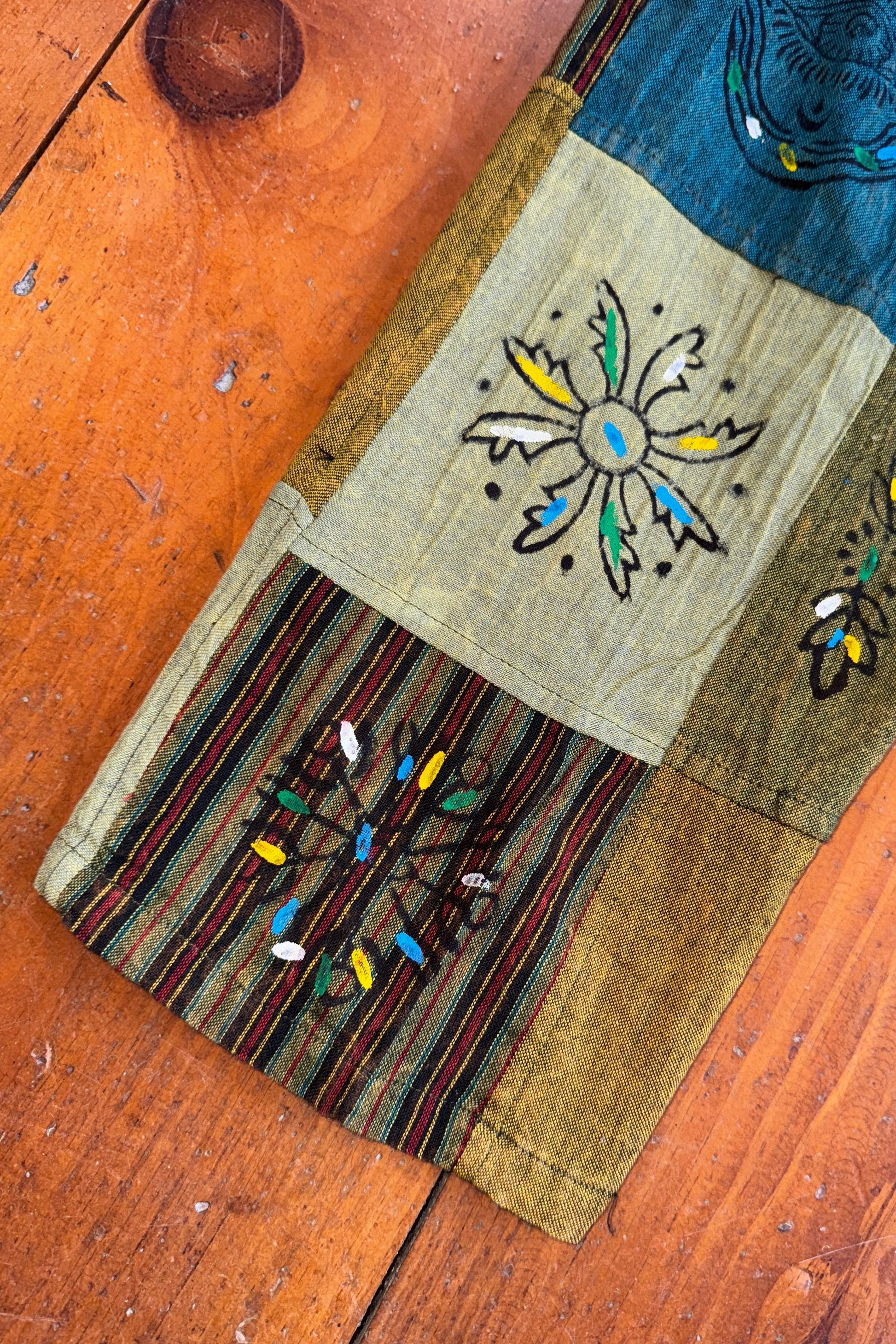 Handcrafted in Nepal, these unique patchwork trousers feature a vibrant mix of teal and varying shades of green patches adorned with hand-painted details and nature symbols throughout. Each pair is truly one-of-a-kind.