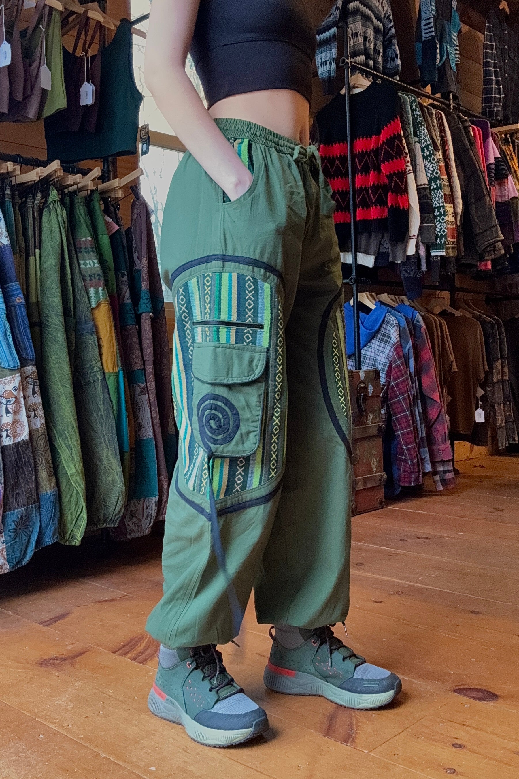 - Cargo pocket with a swirl detail strying, with a playful dangle at the end
